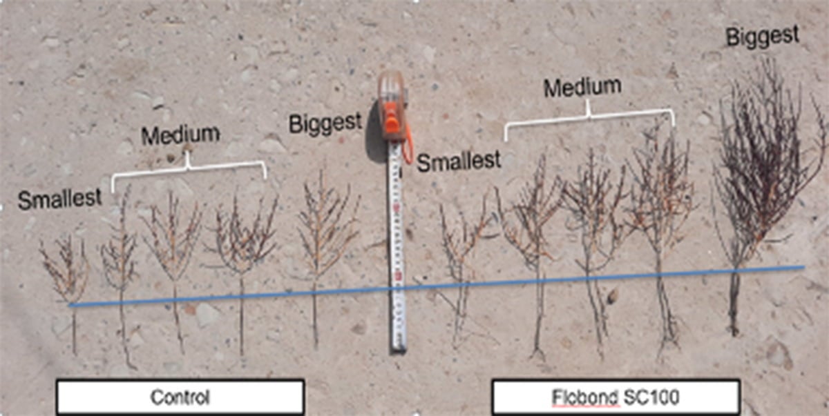 Picture of Saxoul (Haloxylon ammodendron) in Kazakhstan with FLOBOND™ SC 101 Water Coat on the rightand without on the left.