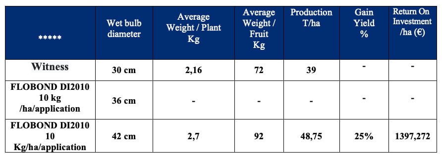 The experiment was installed in Utique, Bizerte North of Tunisia on the cultivation of late season Tomato variety Heinz 9661F1 in order to define the impact of the product FLOBOND DI 2010 on the Culture.