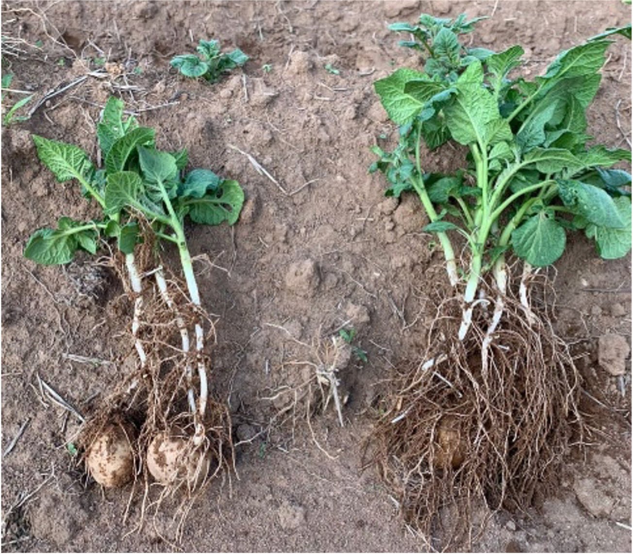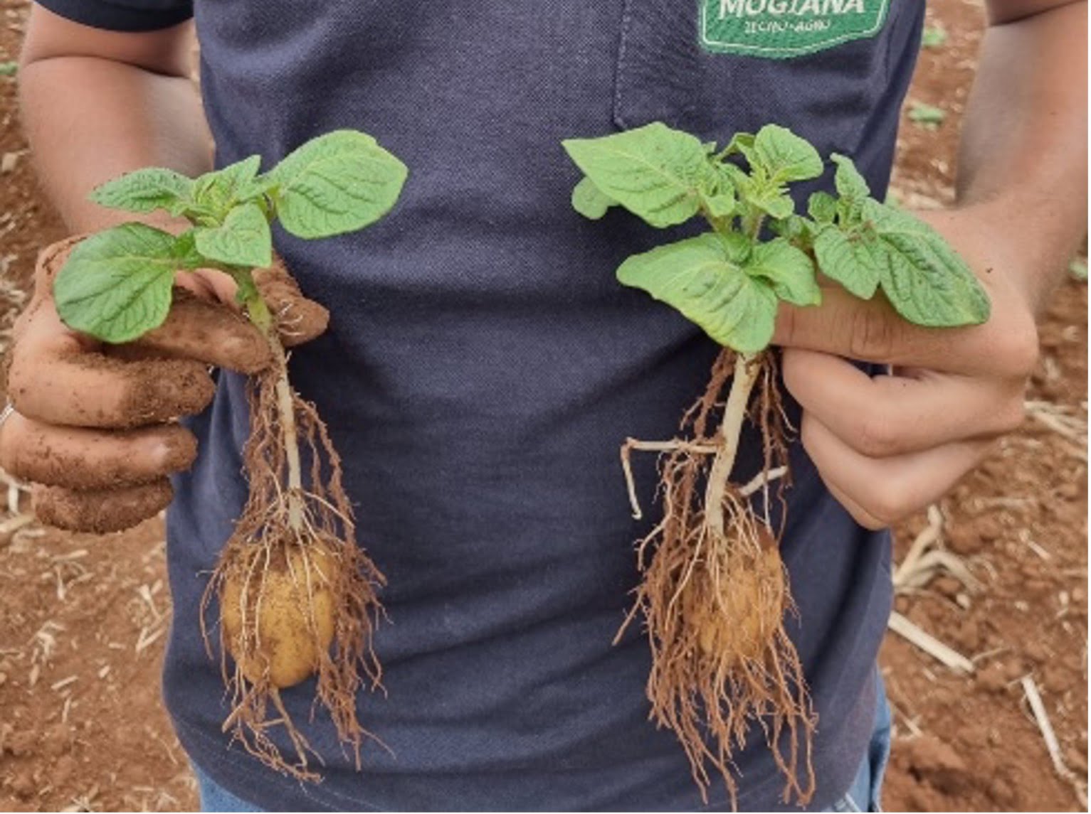 It was noticed faster emergence, faster tubercules formation (third picture on the right). The quality (potatoes size) increased too, which explains partially the difference, the 50kg bag (main unit in Brazil) was sold 15,39 USD for control and 15,81 USD for treatment.