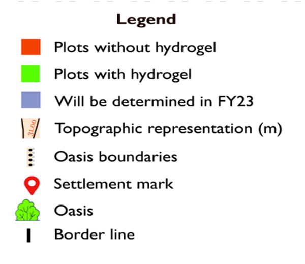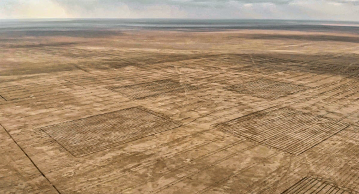 Oasis plots are prepared for black saxaul planting. These individual plots are five hectares each. Some plots will be treated with fencing and hydrogel to test different conditions for optimal growth.