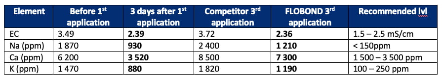 We noticed a significant reduction of EC -32%, Na -50%, Ca -43%, K -40%. The first sample was taken before irrigation and the second one 3 days after. There was no other irrigation between the two analysis and no fertilizer was applied during the irrigation. Producer was impressed by the efficiency of the FLOBOND LX50 ANTISALT.