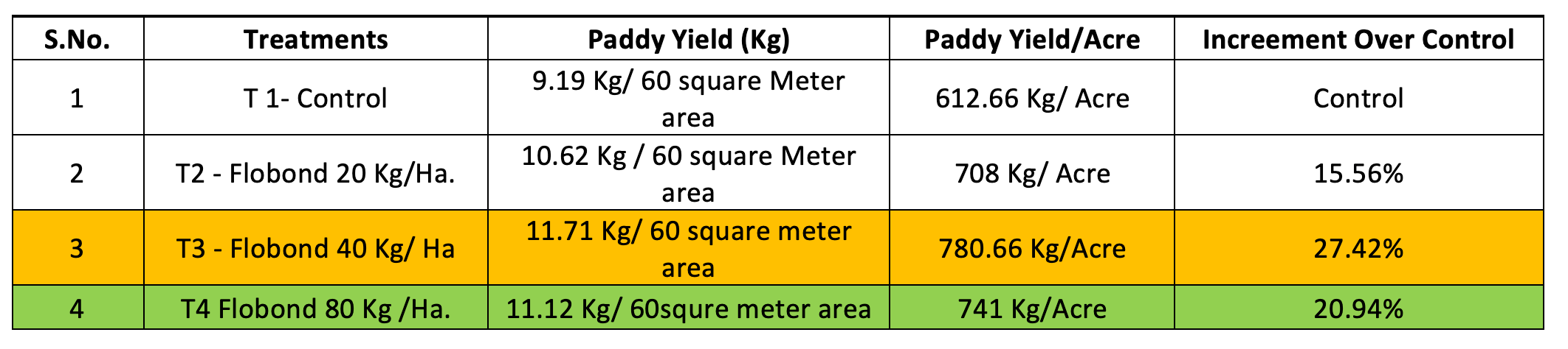We observe that there was no significant difference in PH and salt status but in yield we received significant yield increment over control plot with Flobond LX 50 anti salt application @ 40 Kg/ ha.